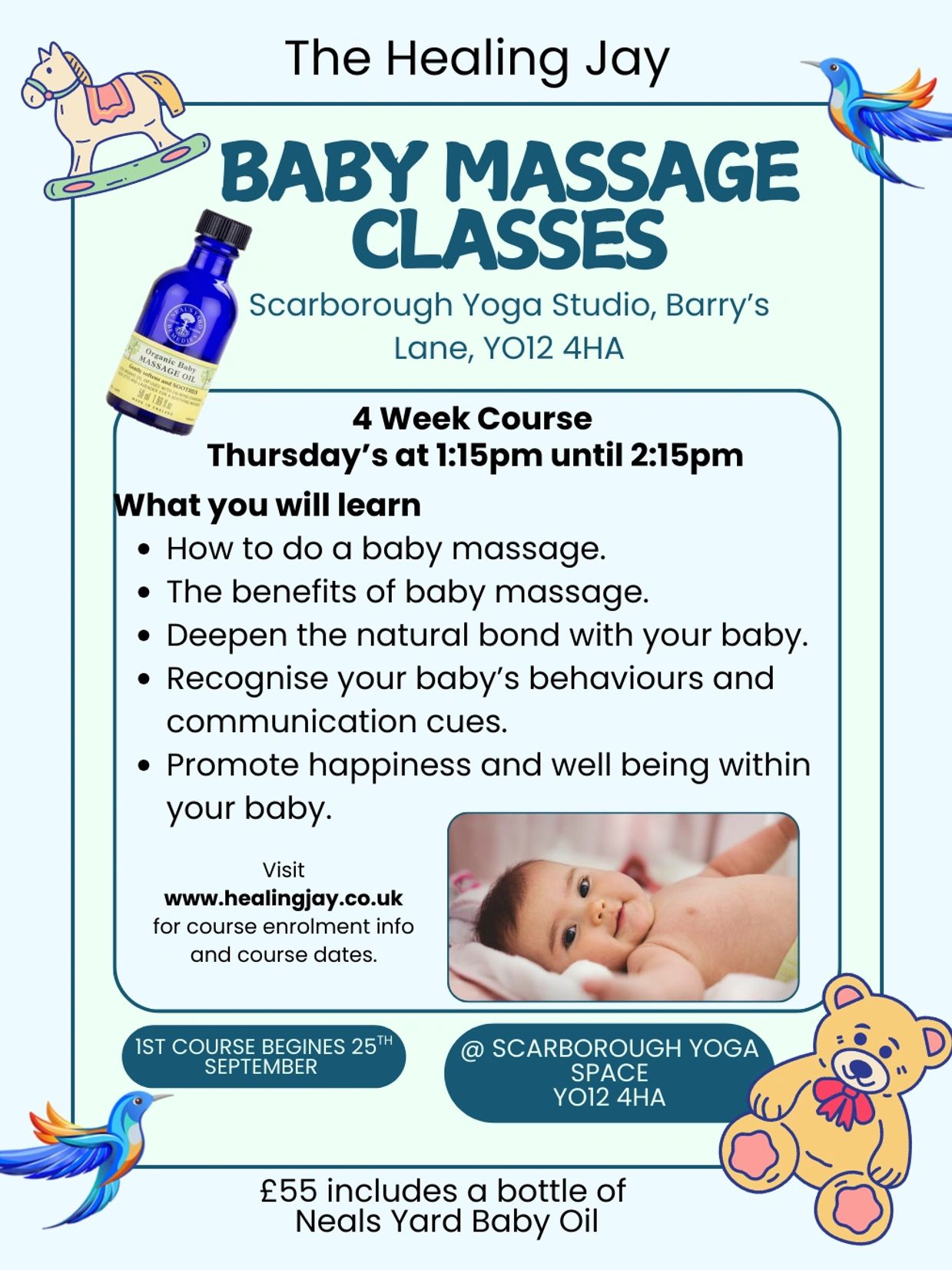 Cost: £55 for a 4 week block. Includes a FREE bottle of NEALS YARD Baby Oil and information pack.
